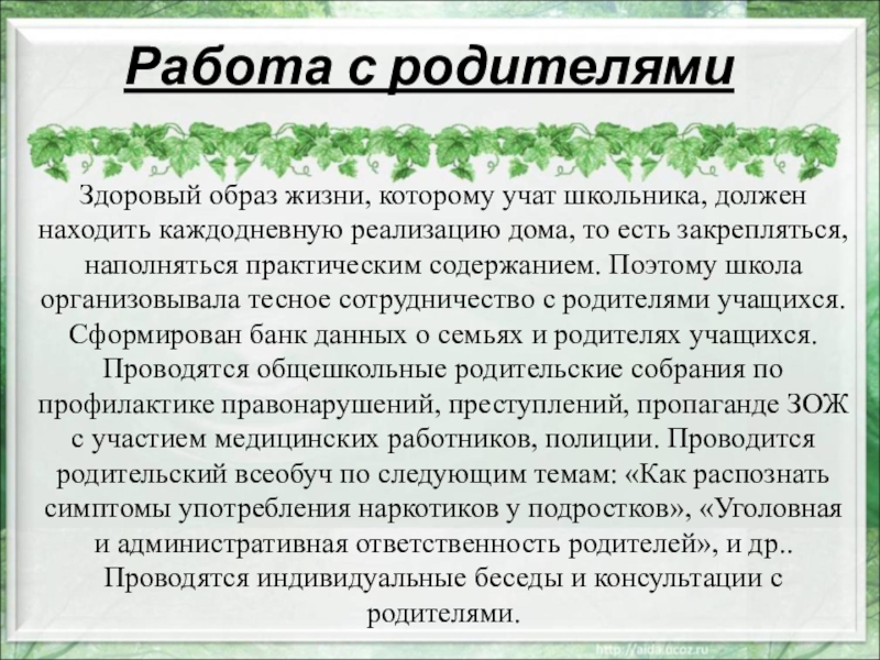 реализацию дома, то есть закрепляться, наполняться практическим содержанием. Поэтому школа организовывала тесное сотрудничество с родителями учащихся. Сформирован банк данных о семьях и родителях учащихся. Проводятся общешкольные родительские собрания по профилактике правонарушений, преступлений, пропаганде ЗОЖ с участием медицинских работников, полиции. Проводится родительский всеобуч по следующим темам: «Как распознать симптомы употребления наркотиков у подростков», «Уголовная и административная ответственность родителей», и др..Проводятся индивидуальные беседы и консультации с родителями.