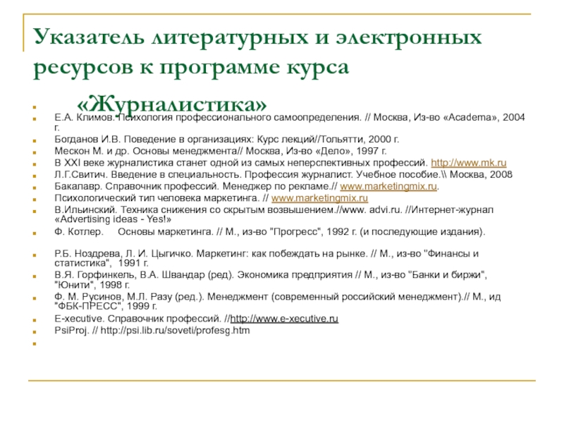 Е.А. Климов. Психология профессионального самоопределения. // Москва, Из-во «Academa», 2004 г.