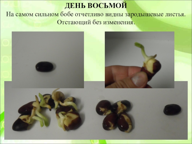 ДЕНЬ ВОСЬМОЙНа самом сильном бобе отчетливо видны зародышевые листья. Отстающий без изменения.