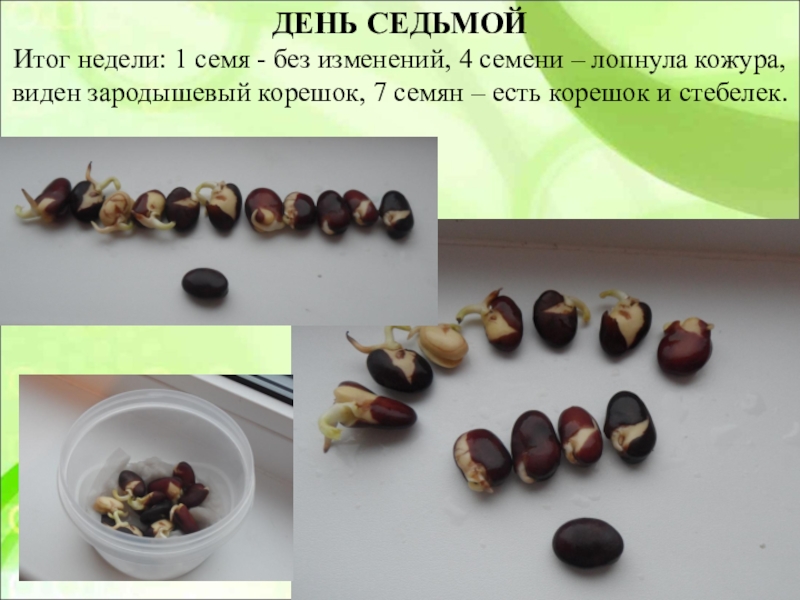 ДЕНЬ СЕДЬМОЙИтог недели: 1 семя - без изменений, 4 семени – лопнула кожура, виден зародышевый корешок, 7