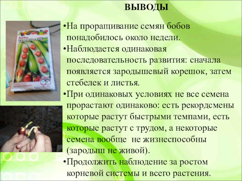 ВЫВОДЫНа проращивание семян бобов понадобилось около недели.Наблюдается одинаковая последовательность развития: сначала появляется зародышевый корешок, затем стебелек и