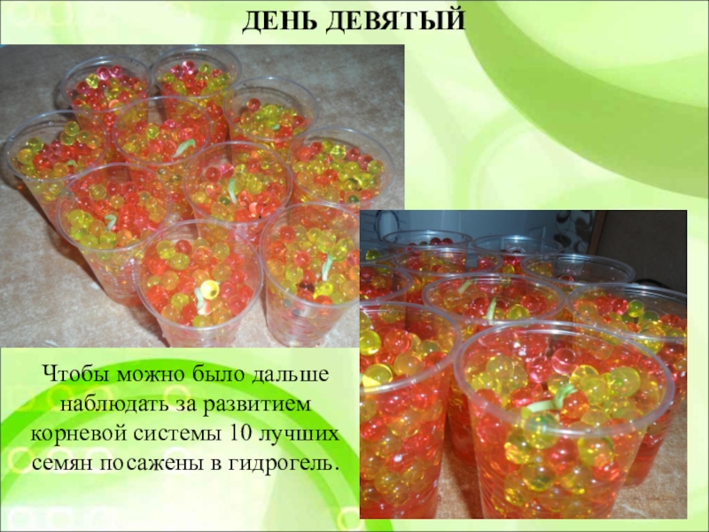 ДЕНЬ ДЕВЯТЫЙЧтобы можно было дальше наблюдать за развитием корневой системы 10 лучших семян посажены в гидрогель.