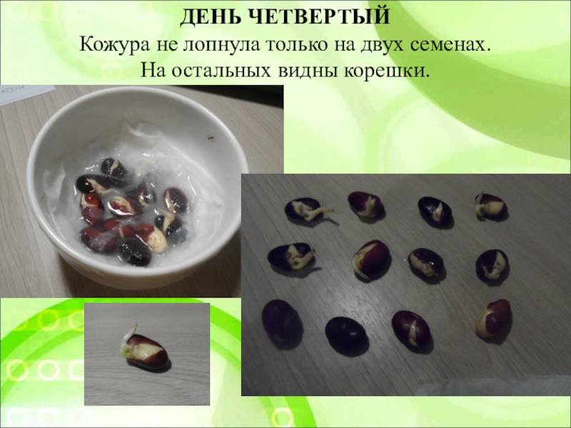ДЕНЬ ЧЕТВЕРТЫЙКожура не лопнула только на двух семенах. На остальных видны корешки.