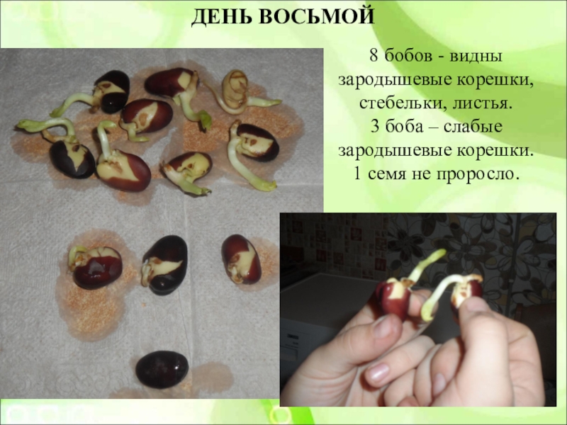 ДЕНЬ ВОСЬМОЙ8 бобов - видны зародышевые корешки, стебельки, листья. 3 боба – слабые зародышевые корешки. 1 семя
