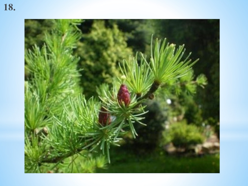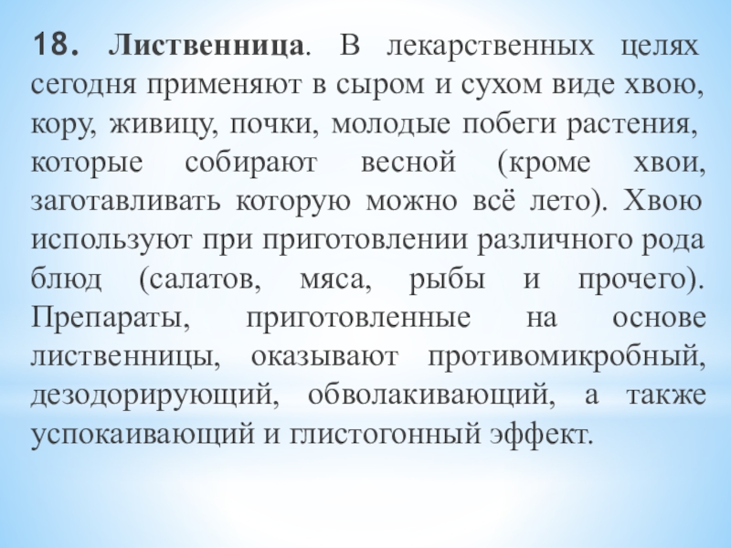 Слайд 5518. Лиственница. В лекарственных целях сегодня применяют в сыром и сухом