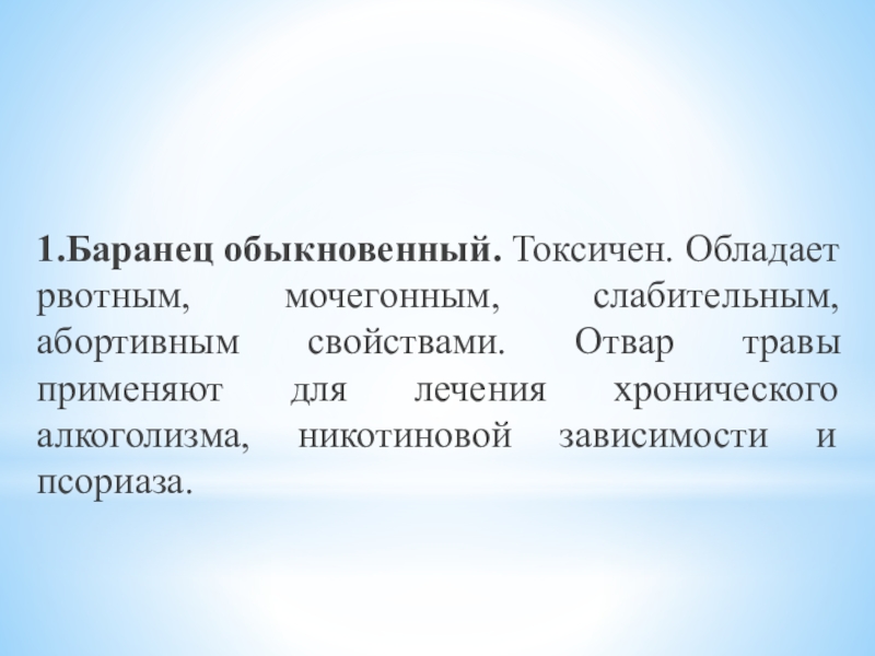 1.Баранец обыкновенный. Токсичен. Обладает рвотным, мочегонным, слабительным, абортивным свойствами. Отвар травы