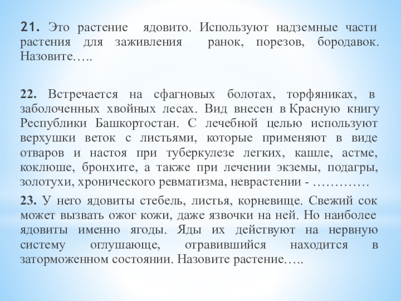 23. У него ядовиты стебель, листья, корневище. Свежий сок может вызвать ожог кожи, даже язвочки на ней. Но наиболее ядовиты именно ягоды. Яды их действуют на нервную систему оглушающе, отравившийся находится в заторможенном состоянии. Назовите растение…..