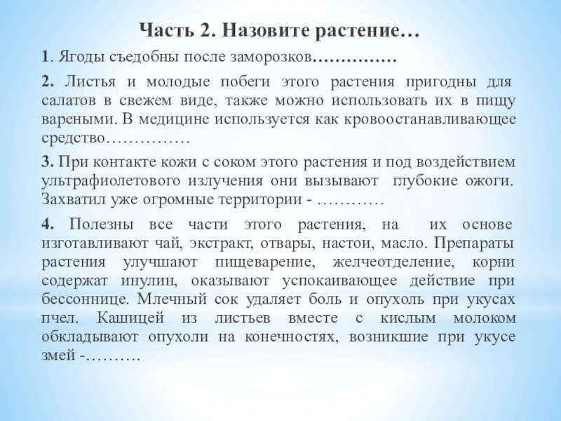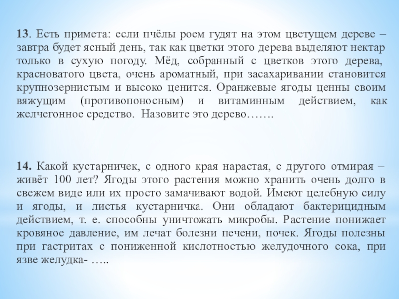 14. Какой кустарничек, с одного края нарастая, с другого отмирая – живёт 100 лет? Ягоды этого растения можно хранить очень долго в свежем виде или их просто замачивают водой. Имеют целебную силу и ягоды, и листья кустарничка. Они обладают бактерицидным действием, т. е. способны уничтожать микробы. Растение понижает кровяное давление, им лечат болезни печени, почек. Ягоды полезны при гастритах с пониженной кислотностью желудочного сока, при язве желудка- …..