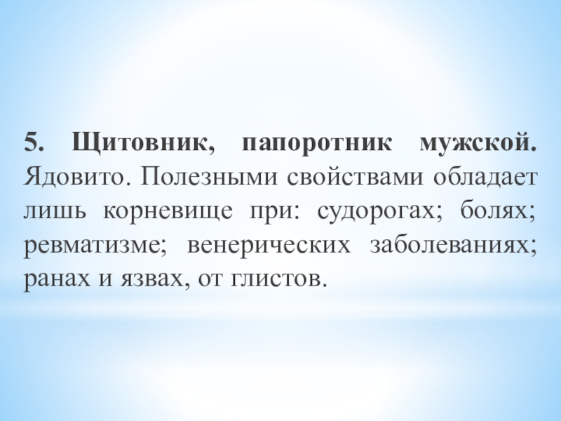 Слайд 295. Щитовник, папоротник мужской. Ядовито. Полезными свойствами обладает лишь корневище при: