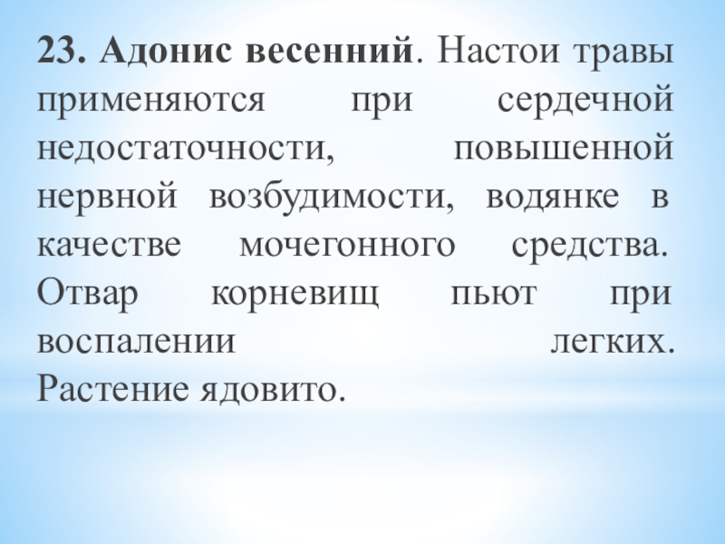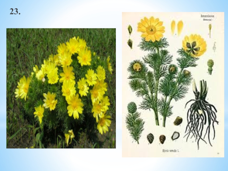 Слайд 6523. Адонис весенний. Настои травы применяются при сердечной недостаточности, повышенной нервной