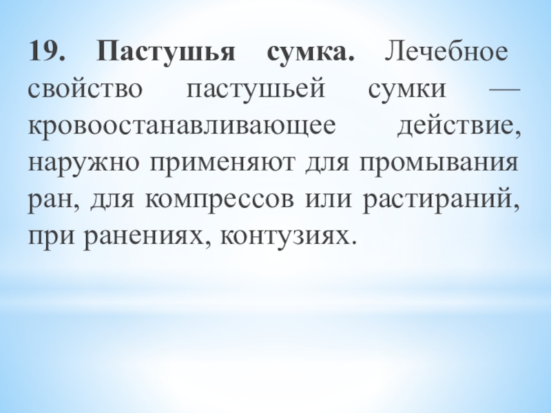 Слайд 5719. Пастушья сумка. Лечебное свойство пастушьей сумки — кровоостанавливающее действие, наружно
