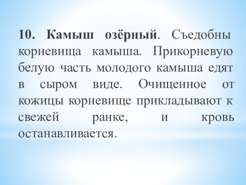 Слайд 3910. Камыш озёрный. Съедобны корневища камыша. Прикорневую белую часть молодого камыша