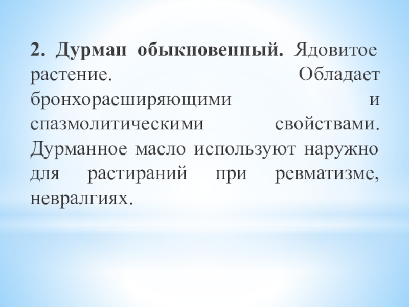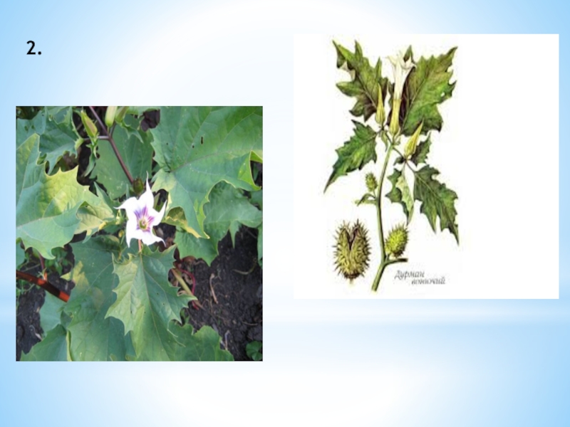Слайд 232. Дурман обыкновенный. Ядовитое растение. Обладает бронхорасширяющими и спазмолитическими свойствами. Дурманное