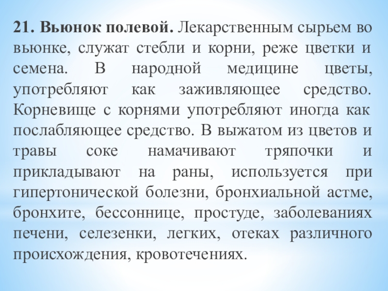 Слайд 6121. Вьюнок полевой. Лекарственным сырьем во вьюнке, служат стебли и корни,