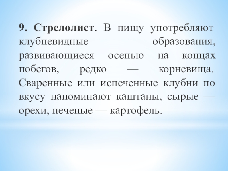 Слайд 379. Стрелолист. В пищу употребляют клубневидные образования, развивающиеся осенью на концах