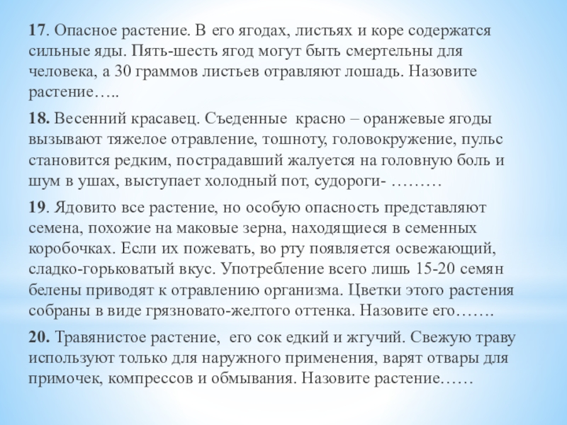 Слайд 1617. Опасное растение. В его ягодах, листьях и коре содержатся сильные