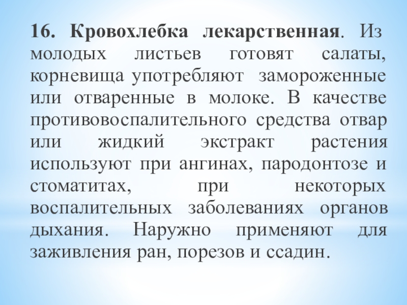 Слайд 5116. Кровохлебка лекарственная. Из молодых листьев готовят салаты, корневища употребляют замороженные
