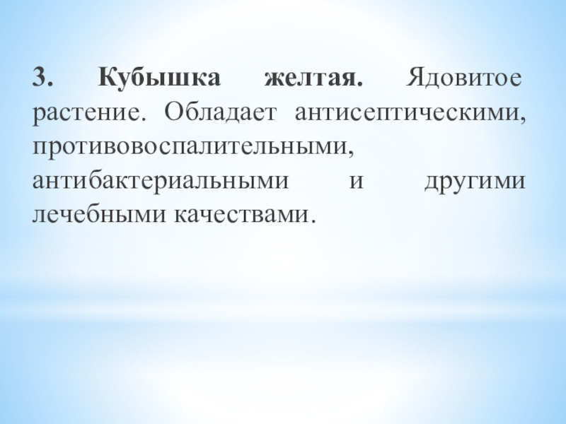 Слайд 253. Кубышка желтая. Ядовитое растение. Обладает антисептическими, противовоспалительными, антибактериальными и другими