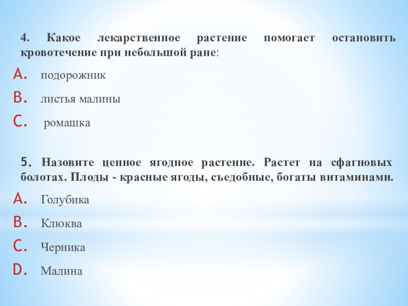 Слайд 44. Какое лекарственное растение помогает остановить кровотечение при небольшой ране: