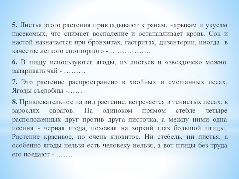 8. Привлекательное на вид растение, встречается в тенистых лесах, в зарослях оврагов. На одиноком прямом стебле четыре расположенных друг против друга листочка, а между ними одна иссиня - черная ягода, похожая на зоркий глаз большой птицы. Растение красивое, но очень ядовитое. Ни сте6ель, ни листья, а особенно ягоды нельзя есть человеку нельзя, а вот птицы без труда его поедают - …….