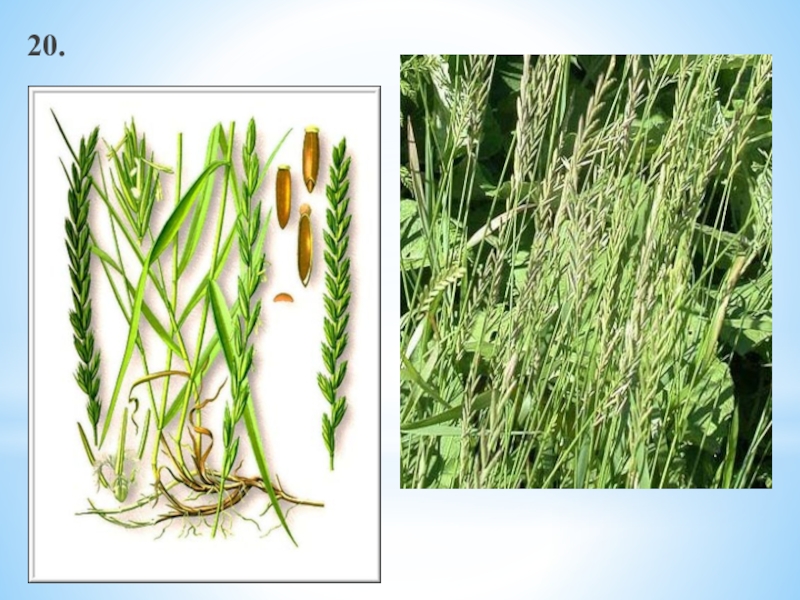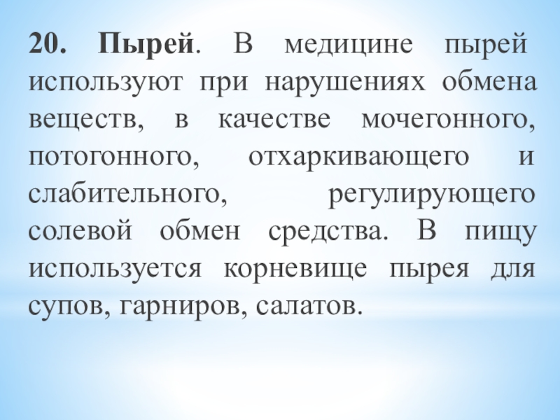 Слайд 5920. Пырей. В медицине пырей используют при нарушениях обмена веществ, в