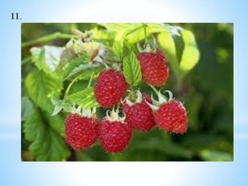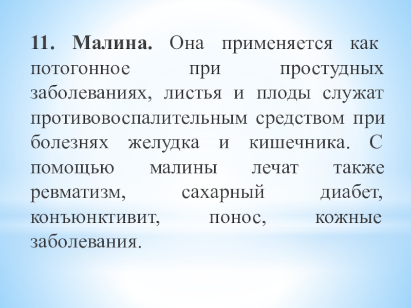 Слайд 4111. Малина. Она применяется как потогонное при простудных заболеваниях, листья и
