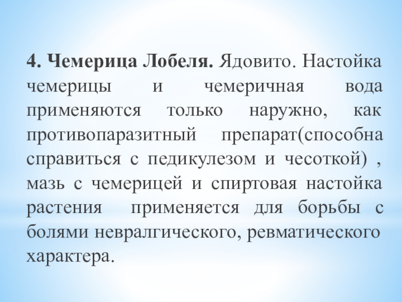 Слайд 274. Чемерица Лобеля. Ядовито. Настойка чемерицы и чемеричная вода применяются только