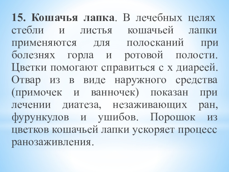 Слайд 4915. Кошачья лапка. В лечебных целях стебли и листья кошачьей лапки