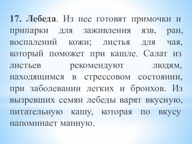 Слайд 5317. Лебеда. Из нее готовят примочки и припарки для заживления язв,