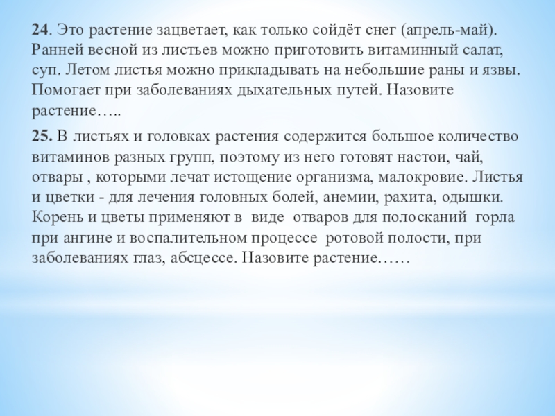Слайд 1824. Это растение зацветает, как только сойдёт снег (апрель-май).Ранней весной из
