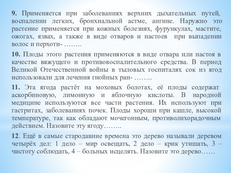 10. Плоды этого растения применяются в виде отвара или настоя в качестве вяжущего и противовоспалительного средства. В период Великой Отечественной войны в тыловых госпиталях сок из ягод использовали для лечения гнойных ран- ……..