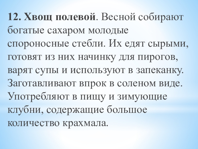 Слайд 4312. Хвощ полевой. Весной собирают богатые сахаром молодые спороносные стебли. Их