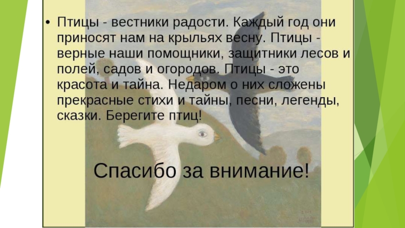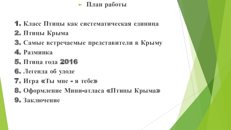 План работы1. Класс Птицы как систематическая единица2. Птицы Крыма3. Самые встречаемые представители в Крыму4. Разминка5. Птица года