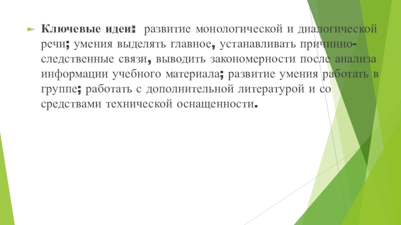 Слайд 5Ключевые идеи:  развитие монологической и диалогической речи; умения выделять главное, устанавливать