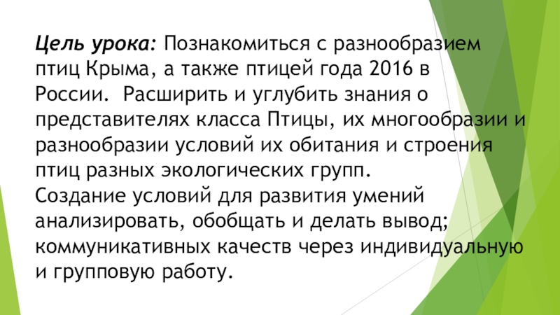 в России.  Расширить и углубить знания о представителях класса Птицы, их многообразии и разнообразии условий их обитания и строения птиц разных экологических групп. Создание условий для развития умений анализировать, обобщать и делать вывод; коммуникативных качеств через индивидуальную и групповую работу.