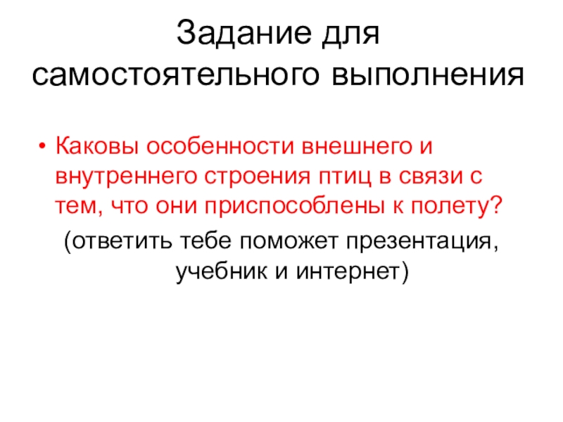 Задание для самостоятельного выполненияКаковы особенности внешнего и внутреннего строения птиц в связи с тем, что они приспособлены