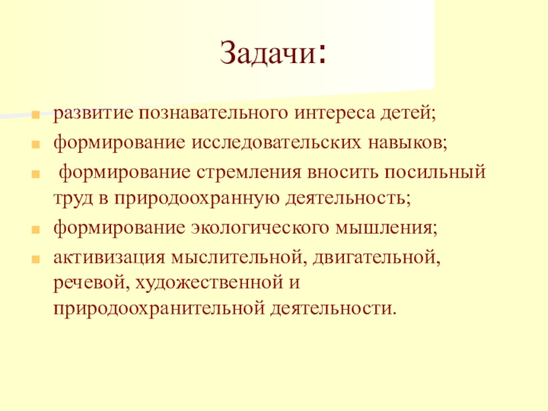 активизация мыслительной, двигательной, речевой, художественной и природоохранительной деятельности.