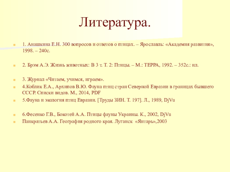 1. Анашкина Е.Н. 300 вопросов и ответов о птицах. – Ярославль: