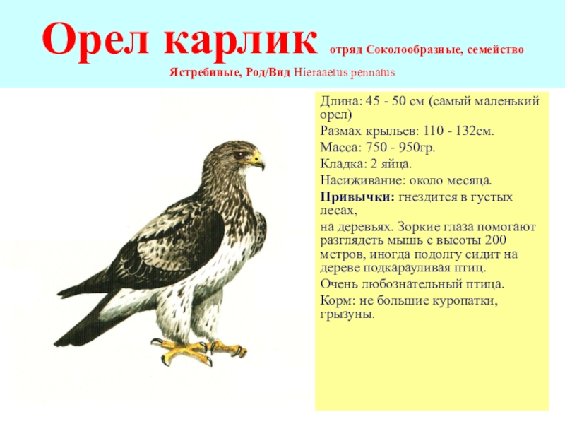 Слайд 9Орел карлик отряд Соколообразные, семейство Ястребиные, Род/Вид Hieraaetus pennatus