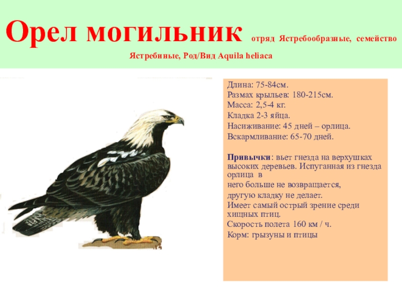 Орел могильник отряд Ястребообразные, семейство Ястребиные, Род/Вид Aquila heliaca