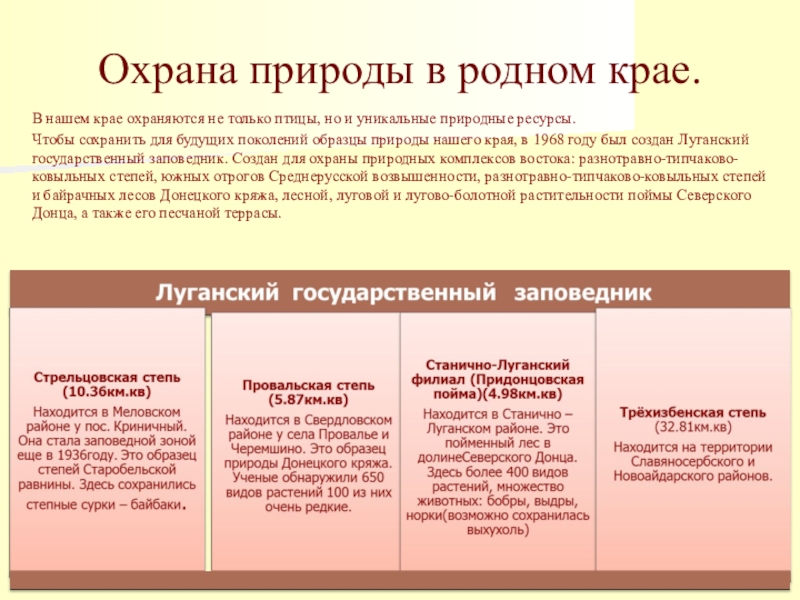Чтобы сохранить для будущих поколений образцы природы нашего края, в 1968 году был создан Луганский государственный заповедник. Создан для охраны природных комплексов востока: разнотравно-типчаково-ковыльных степей, южных отрогов Среднерусской возвышенности, разнотравно-типчаково-ковыльных степей и байрачных лесов Донецкого кряжа, лесной, луговой и лугово-болотной растительности поймы Северского Донца, а также его песчаной террасы.