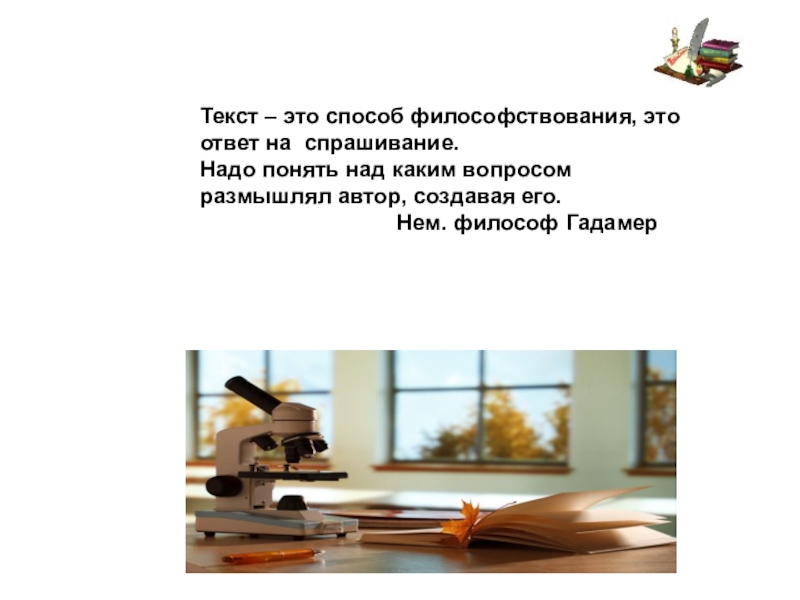 Слайд 2Текст – это способ философствования, это ответ на спрашивание.