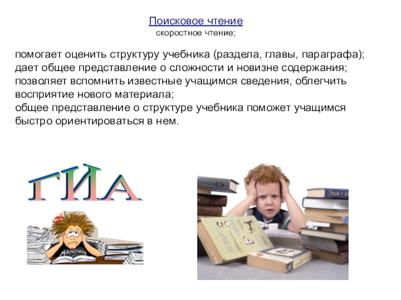 поисковое (просмотровое) – направлено на нахождение конкретной информации, нужного факта;