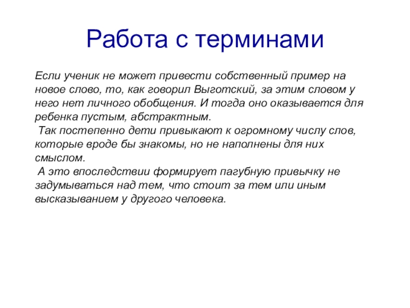 как говорил Выготский, за этим словом у него нет личного обобщения. И тогда оно оказывается для ребенка пустым, абстрактным.