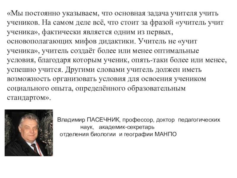 «Мы постоянно указываем, что основная задача учителя учить учеников. На самом деле всё, что стоит за фразой «учитель учит ученика», фактически является одним из первых, основополагающих мифов дидактики. Учитель не «учит ученика», учитель создаёт более или менее оптимальные условия, благодаря которым ученик, опять-таки более или менее, успешно учится. Другими словами учитель должен иметь возможность организовать условия для освоения учеником социального опыта, определённого образовательным стандартом».