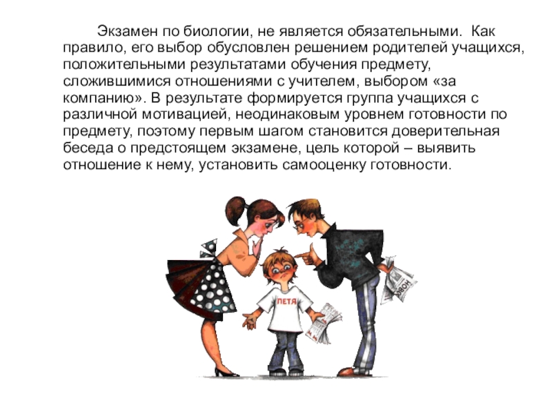 является обязательными. Как правило, его выбор обусловлен решением родителей учащихся, положительными результатами обучения предмету, сложившимися отношениями с учителем, выбором «за компанию». В результате формируется группа учащихся с различной мотивацией, неодинаковым уровнем готовности по предмету, поэтому первым шагом становится доверительная беседа о предстоящем экзамене, цель которой – выявить отношение к нему, установить самооценку готовности.