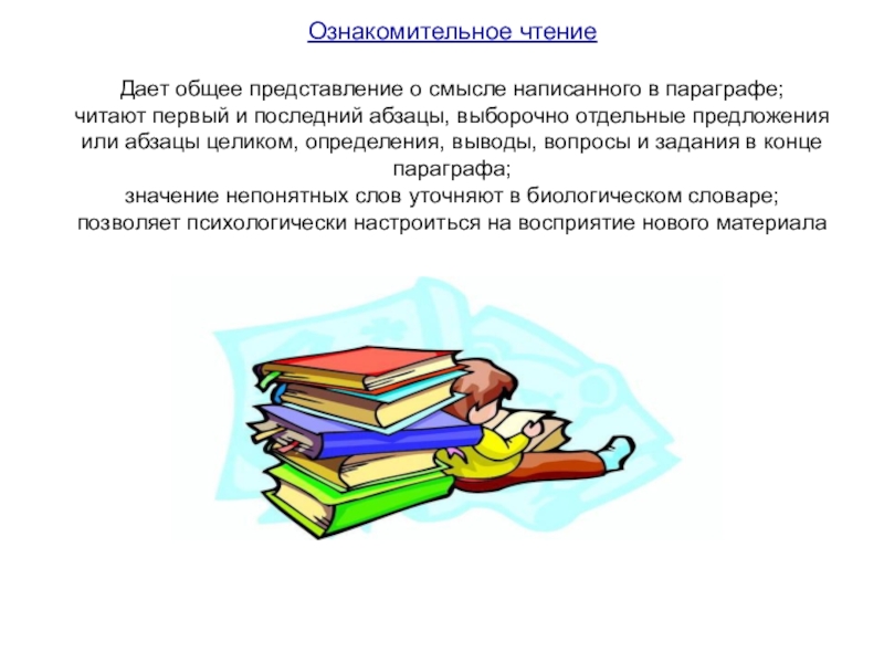 последний абзацы, выборочно отдельные предложения или абзацы целиком, определения, выводы, вопросы и задания в конце параграфа;
