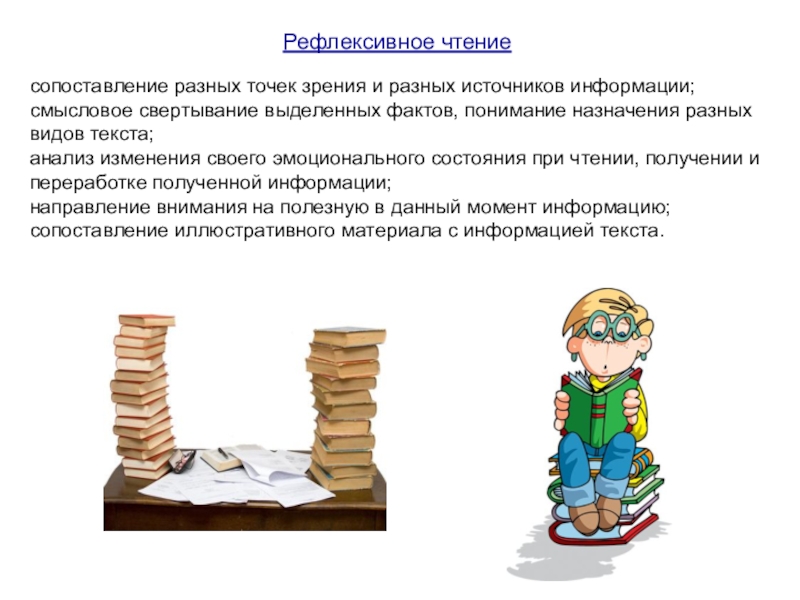 рефлексивное (вдумчивое) – размышление о содержании прочитанного, осмысление своих и чужих интеллектуальных действий, эмоционального состояния.