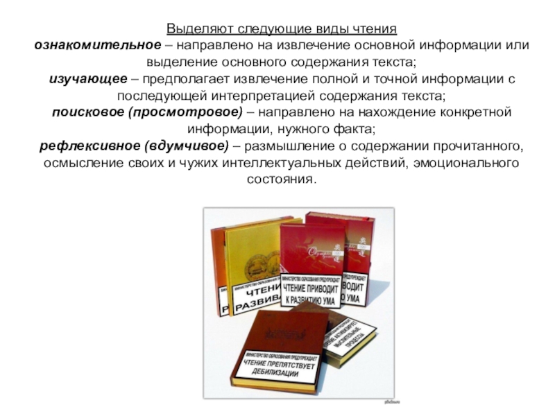 изучающее – предполагает извлечение полной и точной информации с последующей интерпретацией содержания текста;
