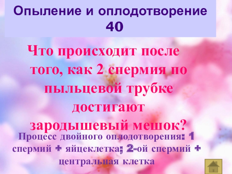 Процесс двойного оплодотворения: 1 спермий + яйцеклетка; 2-ой спермий + центральная клетка